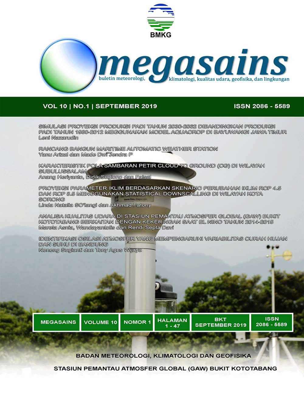 The Megasains Journal was dedicated by the Bukit Kototabang Global Atmosphere Watch Station as a means of publishing scientific works originating from research activities based on meteorology, climatology, air quality and geophysics (MKKuG), and environmental sciences. This journal is published twice a year to provide opportunities for talented writers to contribute.